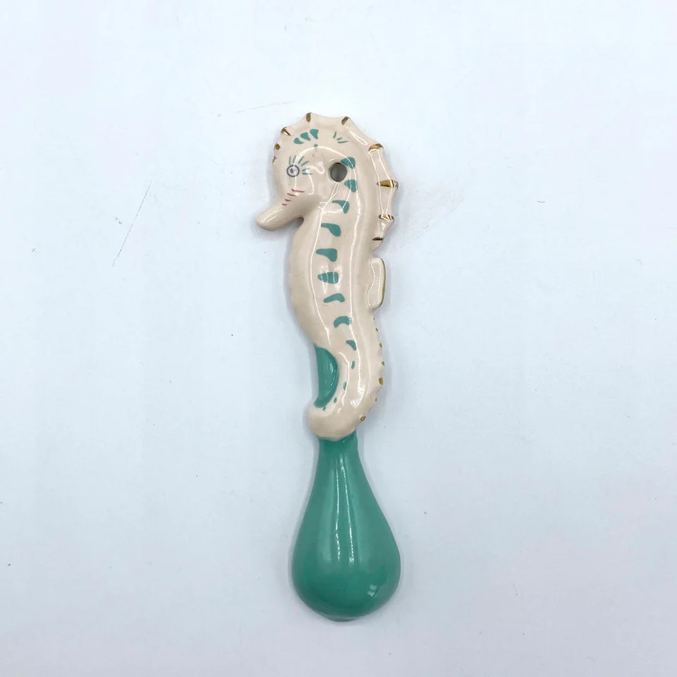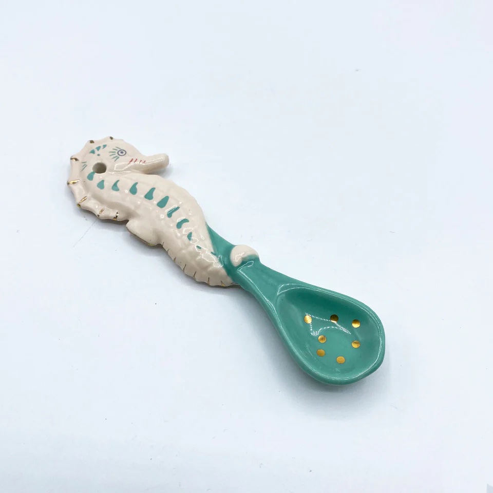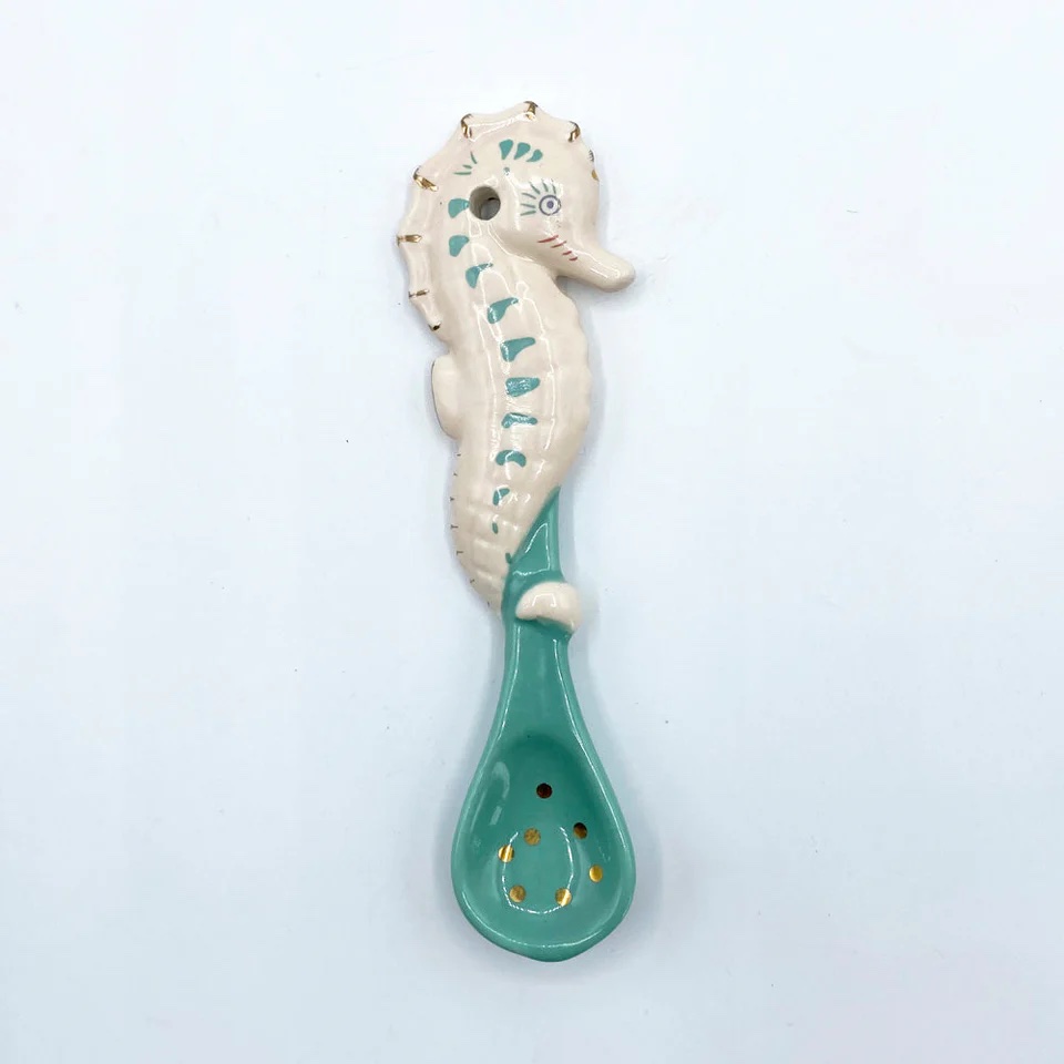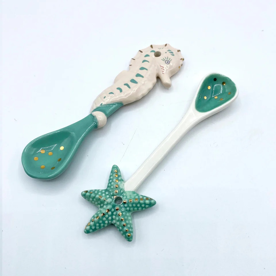 Diese kleinen, süßen Löffel gibt es im Zweierset - einer hält einen kleinen, geriffelten Seestern, der andere ist von einem süßen Seepferdchen umschlungen. Die beiden kleinen Meeresbewohner sind mit Goldfolie verziert, was ihnen einen Hauch von Luxus verleiht. Sie würden sich wunderbar als Teil einer Tischdekoration mit Meeresmotiven eignen oder ein schönes Geschenk für Natur- und Meeresliebhaber sein.