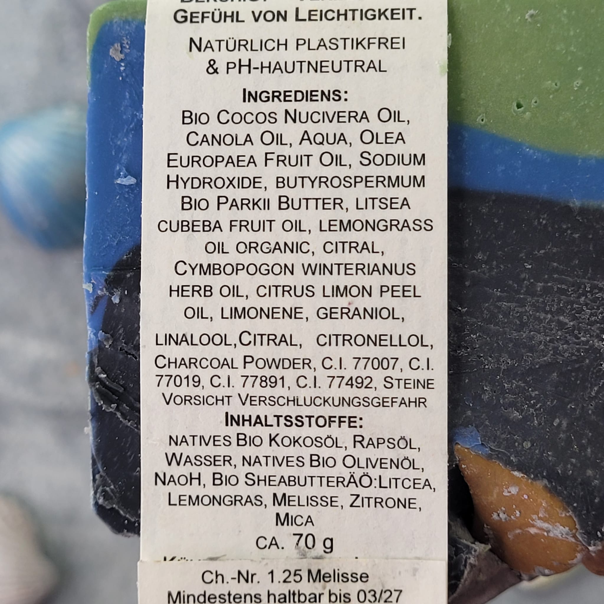 Die Seifenbasis besteht aus reinen Bio Basisölen wie Shea- und Kakaobutter.