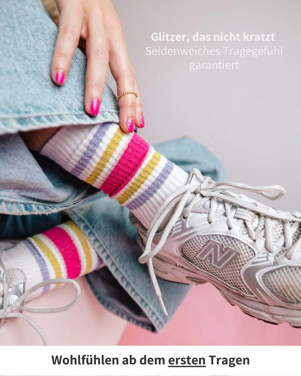 Die Sporty Glitter Socken in Sugar Sunset von ooley sind für alle, die es bequem lieben, aber auf das gewisse Etwas nicht verzichten wollen.
