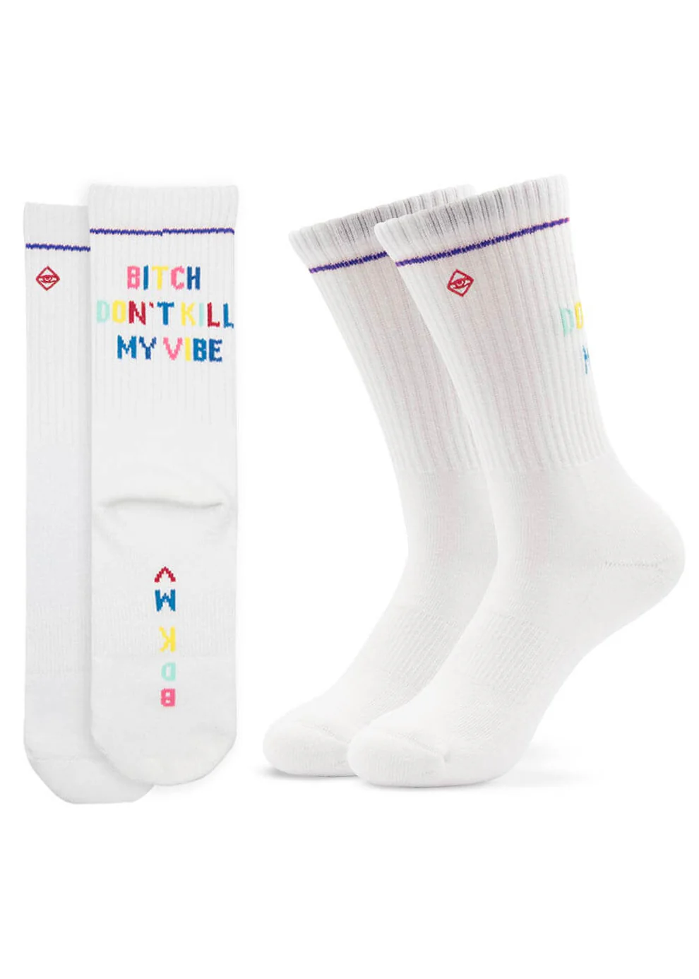 Die Bitch don’t kill my Vibe Socke in weiss, ist ein absoluter Hingucker.