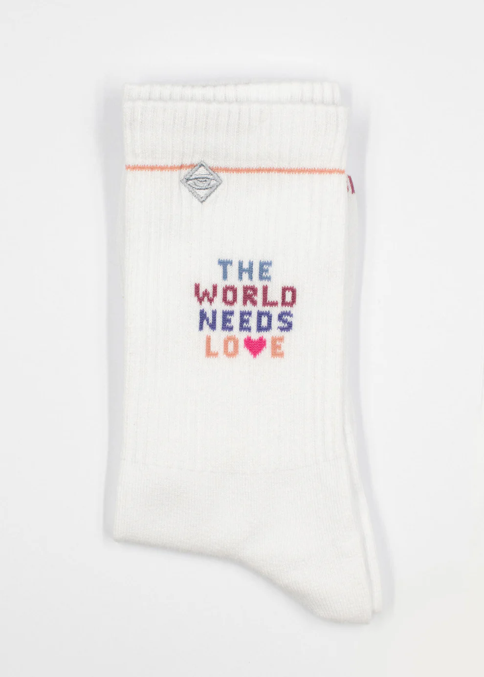 Need of Love - The World needs Love. Weiße Tennissocke mit Spruch und grauen Fußspitzen.... mehr