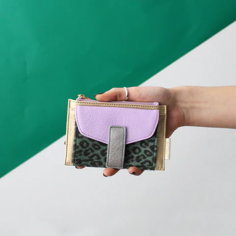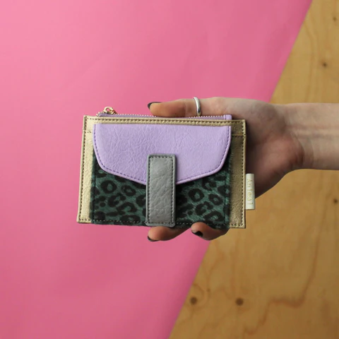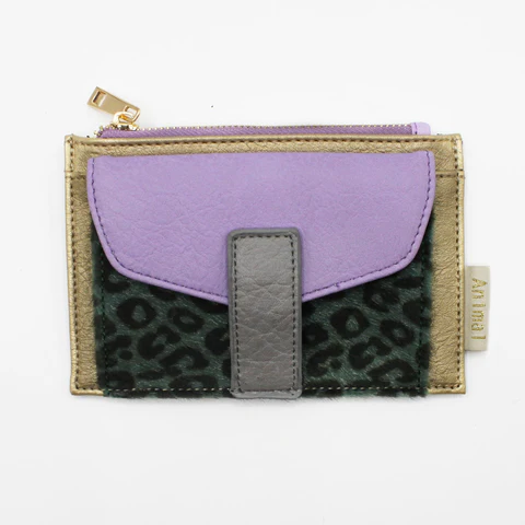 Diese stylische Geldbörse kombiniert lilafarbenes veganes Leder mit einer auffälligen Tasche aus grünem Leoparden-Kunstfell.