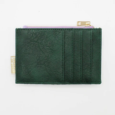 Perfekt organisiert mit 4 Kartenfächern, einer Druckknopftasche vorne und einem Reißverschlussfach in Gold/Lila für Münzen und Bargeld.