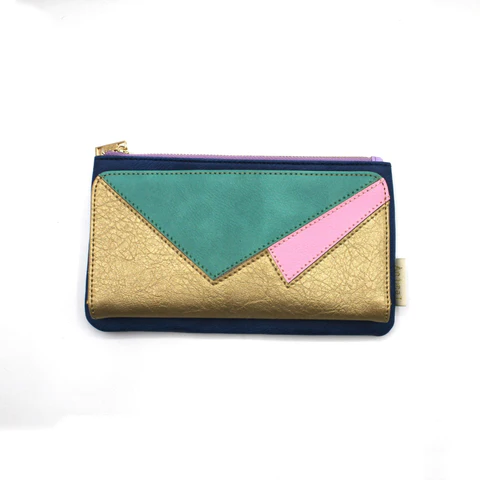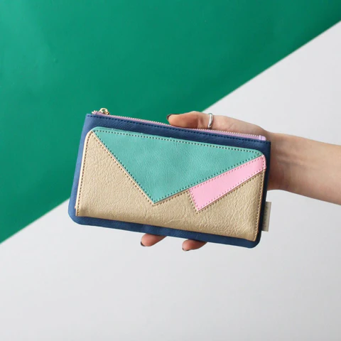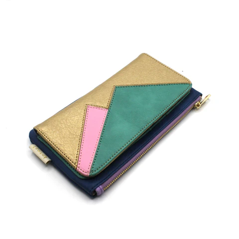 Diese elegante und zeitgemäße Geldbörse kombiniert Stil mit Funktionalität. Die Vorderseite ziert eine gemusterte Tasche mit dreieckigen Lederpaneelen in lebendigen Farben und Metallic, gesichert durch einen Druckknopf. Innen finden Sie: