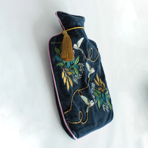 Diese elegante Wärmflasche aus dunkelblauem Samt besticht durch ein wunderschön gesticktes Foliendesign mit fliegenden Schwalben.