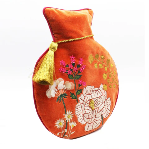 Diese wunderschöne Wärmflasche aus orangefarbenem Samt ist mit bezaubernden, gestickten Blüten und Foliage verziert.